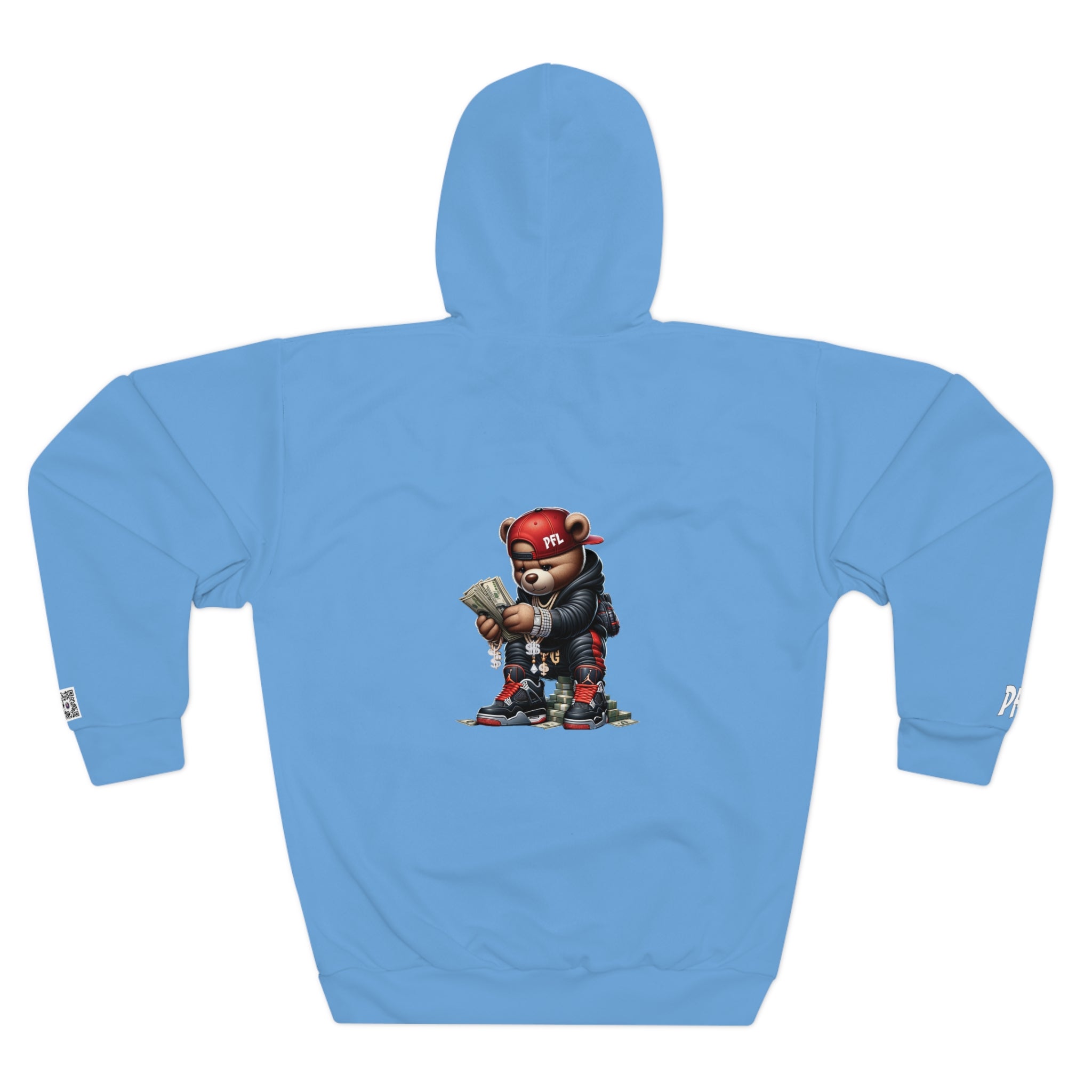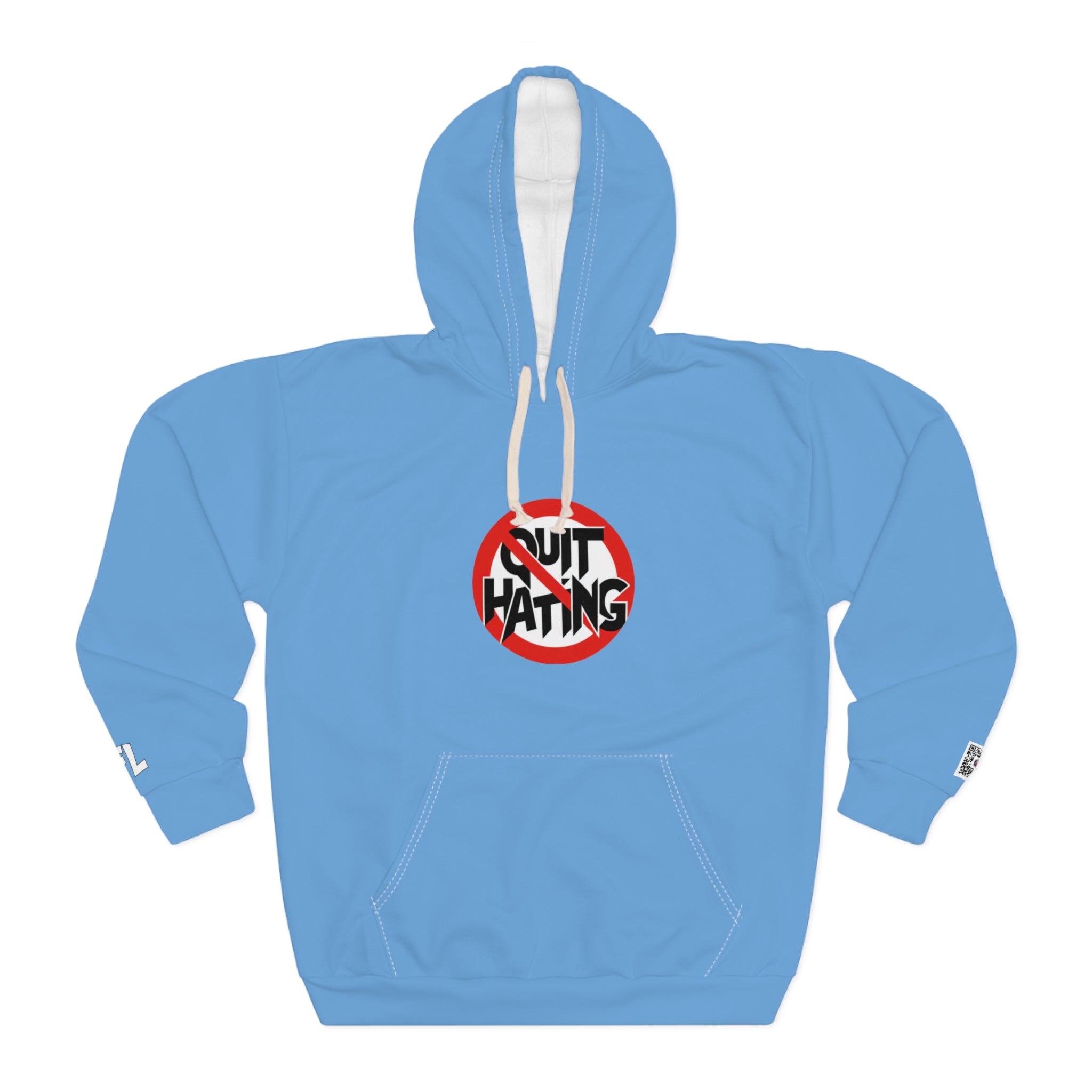This PFL QUIT HATING HOODIE is made for warmth and comfort with a FLY TOUCH. Made to be easily customizable without white lines at the seams, this all-over print pullover hoodie is waiting for you to add a great design and it instantly becomes fashionable. It features a large front pocket, a hood with a drawstring, and is custom cut and sewn.